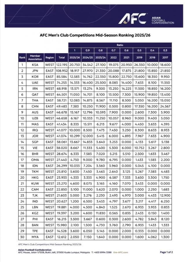 2月23日,亚足联通过官网公布了2025/2026赛季亚足联男子俱乐部赛事中期排名榜,其中沙特阿拉伯联赛位居榜首。而同期中超联赛仅排名第15位,在东亚大区位列暂排名第9位,虽然近8个赛季总排名暂列亚足联第8位,东亚大区第4位,但因中超4队已分别在亚冠精英及二级联赛首阶段赛事中“全军覆没”,且8个赛季累计积分仅比澳超多2.805分,因此至本赛季结束后有可能被澳超反超,从而有可能导致2027/2028赛季中超所获亚冠序列赛事入场券被进一步递减。